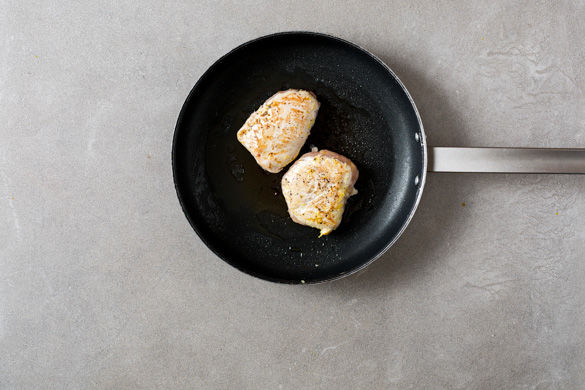 Eine mittlere Pfanne stark erhitzen und die Hähnchen darin von jeder Seite ca. 1-2Min. goldbraun anbraten, mit Salz würzen und schließlich für ca. 8-10Min. im Ofen fertig garen. Tipp: Wer keine ofenfeste Pfanne hat, kann entweder den Henkel in etwas Alufolie einwickeln oder das Fleisch auf ein Ofenblech legen.