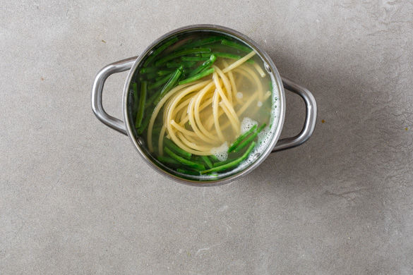 Sobald das Wasser kocht, die Pasta darin für ca. 8-10Min. bissfest garen. Die letzten ca. 4-5Min. die Bohnen zu der Pasta geben und mitgaren. Schließlich die Pasta und Bohnen durch ein Sieb abgießen und abtropfen lassen. Im Topf warmhalten.