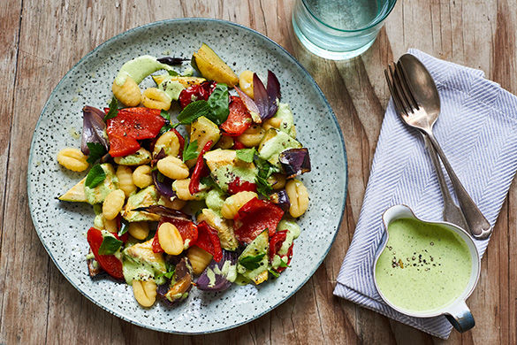 Die Gnocchi mit dem Ofengemüse anrichten und mit der Sauce beträufeln.