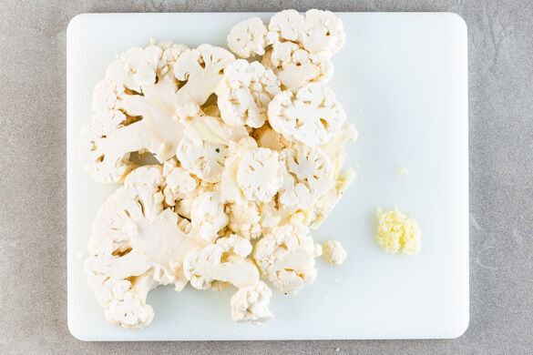 Den Backofen auf 240°C (220°C Umluft) vorheizen. In einem mittelgroßen Topf ausreichend gesalzenes Wasser für die Süßkartoffeln zum Kochen bringen. Den Blumenkohl in 1–2cm dicke Scheiben schneiden. Auch kleinere Stücke können mitgeröstet werden. 2 Knoblauchzehen schälen und fein würfeln.