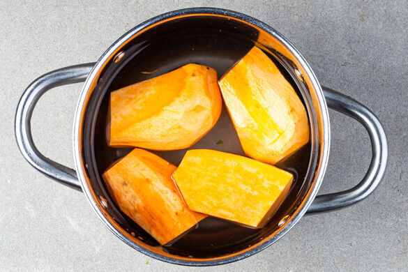 Den Backofen auf 250°C (230°C Umluft) vorheizen. In einem kleinen Topf ausreichend gesalzenes Wasser für die Süßkartoffeln zum Kochen bringen. Die Süßkartoffeln schälen und vierteln, dann in das kochende Wasser geben und in 15–20Min. gar kochen.