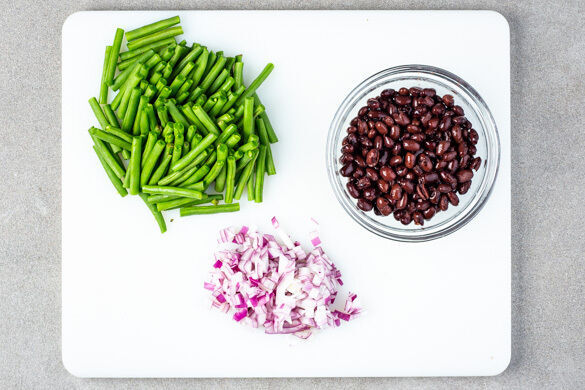 Die grünen Bohnen halbieren und die Enden entfernen. Die Zwiebel schälen und halbieren, dann eine Hälfte fein würfeln. Die schwarzen Bohnen in einem Sieb mit kaltem Wasser abspülen und abtropfen lassen.