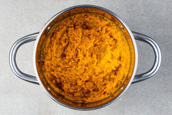 Mit einer Tasse etwas Kochwasser abschöpfen, dann die Süßkartoffeln in ein Sieb abgießen. Zurück in den Topf geben und mit 2EL veganer Margarine und etwas Kochwasser zu einem cremigen Püree stampfen. Nach Geschmack mit der ½ des Currypulvers, ½TL Salz und etwas Pfeffer verfeinern.