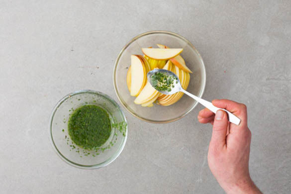 Den Apfel vierteln, entkernen und in dünne Scheiben schneiden. Mit etwas Dressing vermengen, damit die Apfelscheiben nicht braun werden.