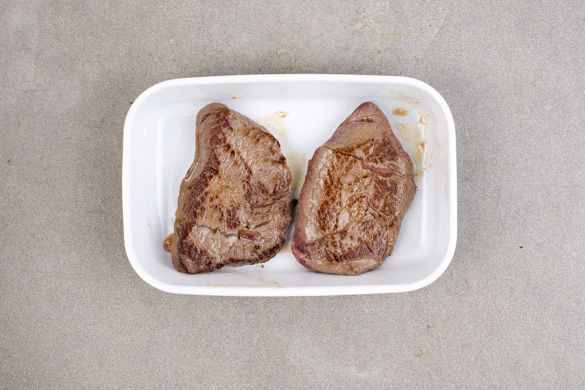 Die Steaks mit etwas Küchenkrepp trocken tupfen und in einer großen Pfanne mit 1–2EL Olivenöl bei mittlerer Hitze auf jeder Seite 1–2Min. anbraten. Das Fleisch aus der Pfanne nehmen, in eine Auflaufform geben, mit Salz und Pfeffer würzen und 6–8Min. im Ofen bis zum gewünschten Garpunkt garen. Die Pfanne aufbewahren.