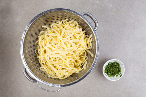 Die Pasta in das kochende Wasser geben und in 7–9Min. bissfest kochen. Währenddessen die Estragonblätter von den Stängeln zupfen und grob schneiden. Die Pasta in ein Sieb abgießen und abtropfen lassen.