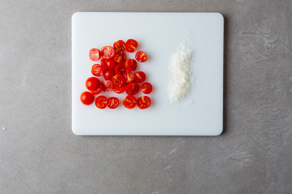 Die Kirschtomaten halbieren. Den Käse fein reiben.