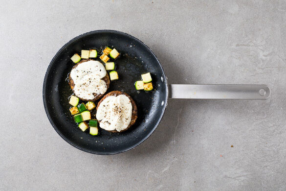 Jedes Patty mit 2 Scheiben Mozzarella belegen und mit Salz und Pfeffer würzen. Die Zucchiniwürfel um die Pattys verteilen und alles 2–3Min. abgedeckt braten. Die Brötchen aufschneiden und 3–5Min. im Ofen aufbacken.