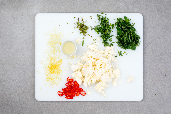 Inzwischen den Feta mit den Fingern oder einer Gabel grob zerkrümeln. Die Zitronenschale abreiben, dann die Zitrone halbieren und auspressen. Die Peperoni in feine Ringe schneiden, ggf. für weniger Schärfe entkernen. Die Minzeblätter abzupfen und grob schneiden. Die Petersilie samt Stängeln grob hacken.