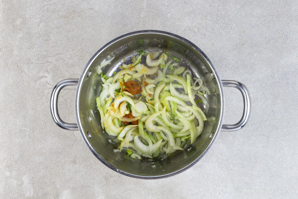 Den restlichen Knoblauch, den restlichen Ingwer, die weißen Teile des Pak Choi und der Lauchzwiebel in dem Topf mit 1–2EL Pflanzenöl bei mittlerer Hitze ca. 1Min. anbraten. Die 1/2 der Currypaste oder nach Geschmack mehr hinzugeben und 1Min. unter Rühren mitbraten.