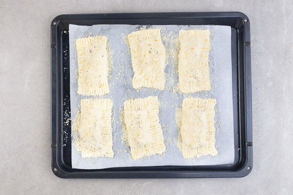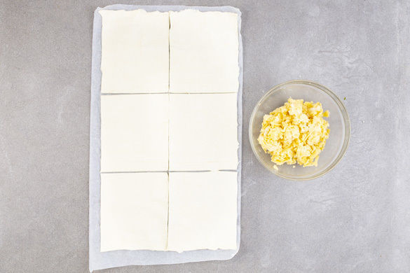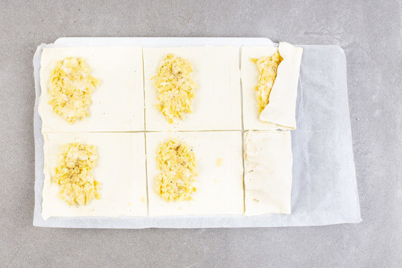 Die Rinde des Taleggio dünn abschneiden und den Käse in kleine Würfel schneiden. Mit dem Gouda und 1 Prise Pfeffer vermengen. Den Teig mit dem Papier nach unten auf einem Backblech ausrollen und in 6 gleich große Rechtecke schneiden.