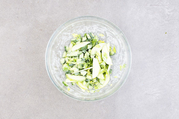 Den Apfel vierteln, entkernen und die 1/2 des Apfels in dünne Scheiben schneiden. Tipp: Wer mag, kann auch mehr Apfel verwenden. Die Gurke längs vierteln und in kleine Würfel schneiden. Die Sellerieblätter abzupfen und fein schneiden.