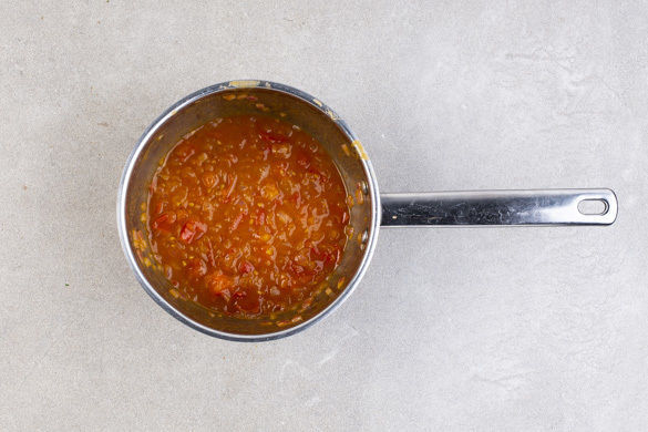 Den Backofen auf 200°C Umluft (220°C Ober-/Unterhitze) vorheizen. Die Tomaten grob würfeln. Die Zwiebel schälen, halbieren, fein würfeln und in einem kleinen Topf mit 1EL Olivenöl bei mittlerer Hitze 2–3Min. glasig anbraten. Die Tomaten, 50ml Wasser, 1EL Essig, die 1/2 des Currypulvers, 1/2EL Honig oder Zucker und 1/2TL Salz unterrühren und die Sauce 8–10Min. eindicken lassen.