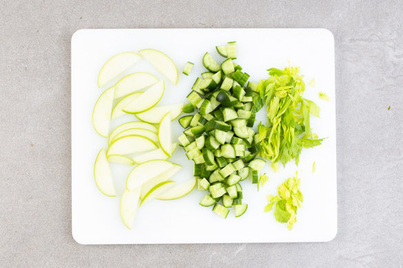 Den Apfel vierteln, entkernen und in dünne Scheiben schneiden. Die Gurke längs vierteln und in kleine Würfel schneiden. Die Sellerieblätter abzupfen und fein schneiden.