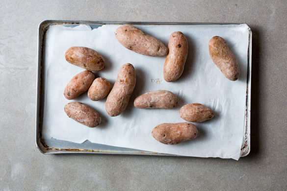 Den Backofen auf 180°C Umluft (200°C Ober-/Unterhitze) vorheizen. Die Kartoffeln in einen großen Topf legen, ohne sie zu stapeln. Tipp: Wer mag, kann auch zwei Töpfe verwenden. 3–4EL Salz in 2L heißem Wasser auflösen und über die Kartoffeln gießen, sodass sie gerade bedeckt sind. Das Wasser zum Kochen bringen und die Kartoffeln 15–20Min. auf mittlerer Hitze offen kochen lassen.