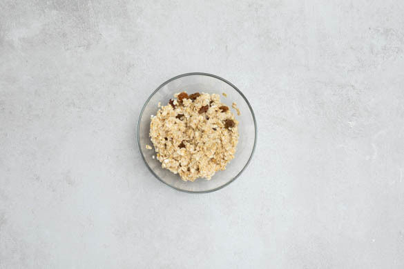 4EL Haferflocken und die Rosinen mit 100ml heißem Wasser übergießen und quellen lassen.