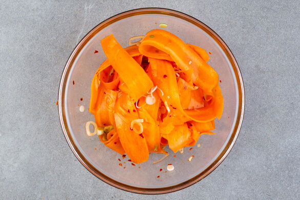 Die Karotten ggf. schälen und mit einem Sparschäler in breite Streifen schneiden. Den weißen Teil der Lauchzwiebel in dünne Ringe schneiden. Den Knoblauch schälen und grob würfeln. Die Karottenstreifen, die weißen Lauchzwiebelringe und den Knoblauch mit ¼ der Chiliflocken oder mehr, 1TL Zucker, ½TL Salz sowie 2EL hellem Essig in eine hitzebeständige Schale geben.