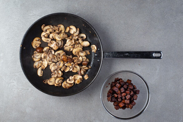 Den Tofu trocken tupfen, in 1–2cm große Würfel schneiden und in derselben Pfanne mit 2EL Pflanzenöl bei mittlerer bis starker Hitze 3–4Min. rundum goldbraun braten. Den Tofu herausnehmen, die Pilze in die Pfanne geben und ca. 5Min. braten, bis die Flüssigkeit größtenteils verdampft ist und die Pilze goldbraun sind.