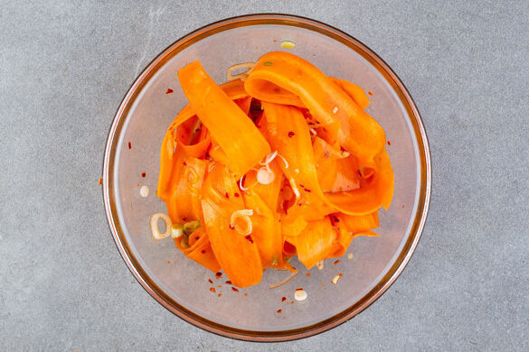 Die Karotten ggf. schälen und mit einem Sparschäler in breite Streifen schneiden. Den weißen Teil der Lauchzwiebeln in dünne Ringe schneiden. Den Knoblauch schälen und grob würfeln. Die Karottenstreifen, die weißen Lauchzwiebelringe und den Knoblauch mit der ½ der Chiliflocken, 1½TL Zucker, 1TL Salz sowie 3EL hellem Essig in eine hitzebeständige Schale geben.