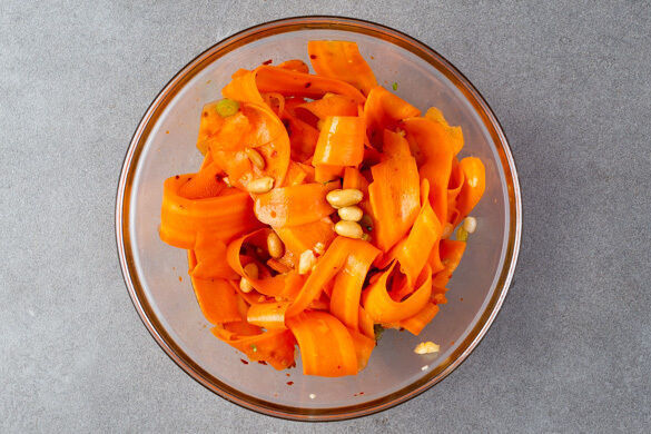 Die Erdnüsse in einer großen Pfanne mit 3EL Pflanzenöl bei mittlerer Hitze in 1–2Min. appetitlich braun anbraten. Die heißen Erdnüsse samt Öl über den Karottensalat gießen und gut vermengen.