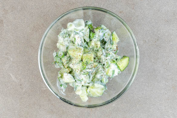 Die Gurke längs vierteln und grob würfeln. Die Lauchzwiebeln in feine Ringe schneiden. Die Minzeblätter von den Stängeln zupfen und grob schneiden.