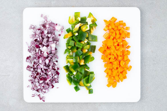Die Süßkartoffel schälen und in 0,5–1cm große Würfel schneiden. Die Paprika vierteln, entkernen und in ca. 1cm große Würfel schneiden. Die Zwiebel schälen, halbieren und fein würfeln.