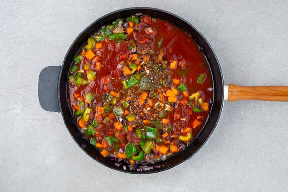 Den Knoblauch und 1TL Gewürzmischung unter das Gemüse rühren und ca. 1Min. mitbraten, dann mit den passierten Tomaten und 200ml Wasser ablöschen. Die Flüssigkeit einmal aufkochen lassen, dann die Hitze auf niedrige Stufe reduzieren und das Gemüse ca. 10Min. sanft köcheln lassen, bis die Süßkartoffeln gar sind.