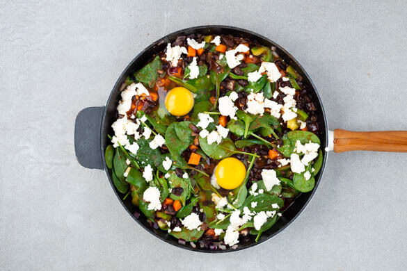 Die Shakshuka ist ein echtes Allroundtalent. Sie passt mit ihrer Wandlungsfähigkeit zu jeder Tageszeit und ist einfach immer das Richtige – zum Frühstück, Mittag- oder Abendessen, oder auch mal als Mitternachtssnack. In der würzigen Tomatensauce versteckt sich viel Gemüse, dazu das leckere Ei, der cremige Käse und der zarte Spinat – mmh!