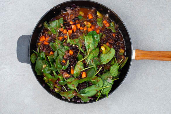 Die Bohnen unterrühren, dann ca. ⅔ des Spinats unterheben und zusammenfallen lassen.