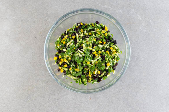 Die Bohnen mit den weißen Lauchzwiebeln, dem Spinat, der Paprika, der Chilischote nach Belieben, dem Mais und ca. ⅔ des Käses vermengen. Die Füllung mit 1 kräftigen Prise Salz und 1 Prise Pfeffer würzen.