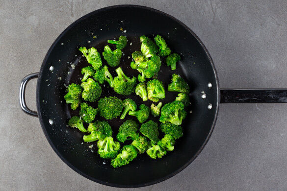 Die Karotte mit einem Sparschäler in dünne Streifen schneiden und mit 1EL hellem Essig, 1 kräftigen Prise Salz und ggf. 1 Prise Zucker mischen und beiseitestellen. Den Brokkoli in der Pfanne mit 1EL Pflanzenöl bei mittlerer Hitze ca. 1Min. anbraten.