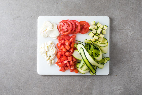 Den Backofen auf 200°C (180°C Umluft) vorheizen. Den Mozzarella in dünne Scheiben schneiden, 4 Scheiben beiseitelegen, die restlichen Scheiben würfeln. 4 Tomatenscheiben abschneiden und beiseitelegen. Die übrige Tomate und die zweite Tomate würfeln. Die Zucchini mit einem Sparschäler in feine Streifen schneiden, das Kerngehäuse auslassen und in Würfel schneiden.