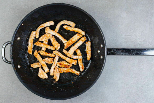 Das Fleisch trocken tupfen, in ca. 1cm dicke Streifen schneiden und in einer großen Pfanne mit 2EL Pflanzenöl bei mittlerer bis starker Hitze 2–3Min. rundum scharf anbraten. Mit je 1 kräftigen Prise Salz und Pfeffer würzen und auf einem Teller beiseitestellen.