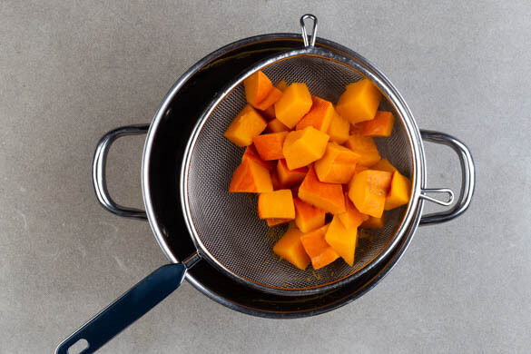 Den Backofen auf 200°C (180°C Umluft) vorheizen. In einem mittelgroßen Topf ausreichend Wasser für die Kürbisse aufkochen. Die Kürbisse halbieren, mit einem Löffel entkernen und in 2–3cm große Würfel schneiden. Mit 1 kräftigen Prise Salz in den Topf geben und bei mittlerer Hitze in ca. 6Min. weich kochen, dann in ein Sieb abgießen, den Topf auswischen.
