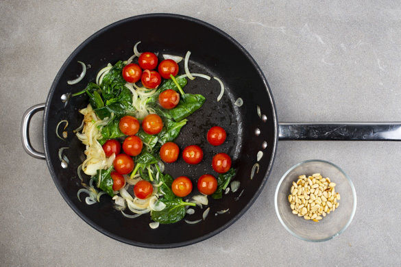 Wenn leichte Röstspuren am Knoblauch zu sehen sind, ca. ¾ des Spinats nach und nach hinzugeben und schwenken, bis er zusammengefallen ist. Die Kirschtomaten dazugeben und heiß werden lassen. Die Pinienkerne in einer kleinen Pfanne ohne Zugabe von Fett bei mittlerer Hitze 1–2Min. goldbraun anrösten, dann aus der Pfanne nehmen. Vorsicht, sie können schnell zu dunkel werden.