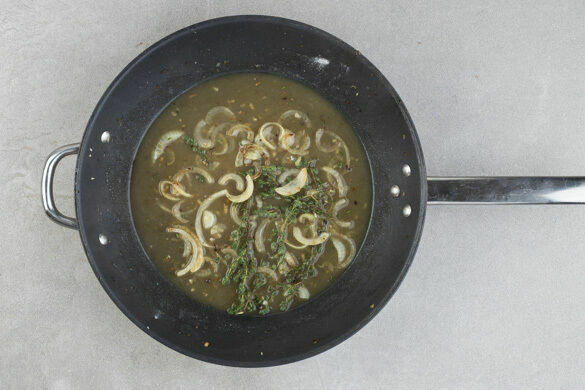 Die übrige Zwiebel in dünne Streifen schneiden und mit dem restlichen Knoblauch in der Pfanne mit 1EL Olivenöl bei mittlerer Hitze 2–3Min. anbraten. 2TL Mehl untermengen, ca. 20Sek. mitbraten, dann das Brühgewürz, den Thymian samt Stängeln und 400ml Wasser einrühren und mit je 1 Prise Pfeffer und Zucker zum Kochen bringen. Die Sauce ca. 10Min. einköcheln lassen.