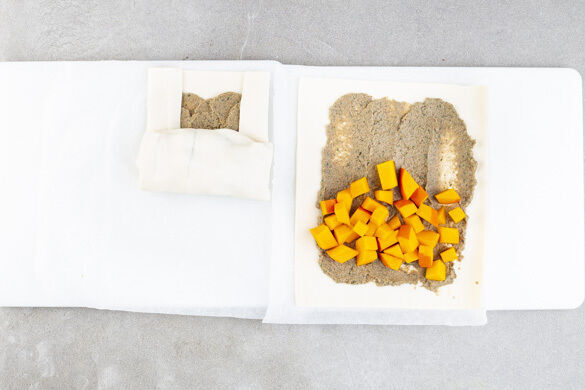 Den Teig mit dem Papier nach unten ausrollen, quer halbieren und mit der Pilzcreme bestreichen. Den Kürbis auf der jeweils unteren Seite der Teige verteilen und mit je 1 kräftigen Prise Salz und Pfeffer würzen. Die Längsseiten der Teige nach innen über die Füllung legen. Die Teige an den Querseiten mit den Kürbiswürfeln beginnend einschlagen.