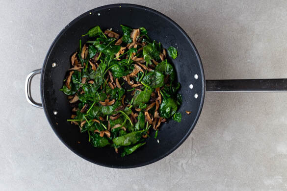 Die Pilze und den Knoblauch in einer großen Pfanne mit 2EL Pflanzenöl bei starker Hitze 2–3Min. anbraten. Den Spinat nach und nach unterheben und zusammenfallen lassen. Mit Salz und Pfeffer würzen.