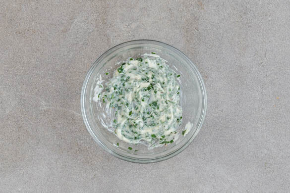Den Backofen auf 220°C (200ºC Umluft) vorheizen. Den Schnittlauch in kleine Röllchen schneiden und mit 4EL Mayonnaise verrühren, mit je 1 Prise Salz und Pfeffer würzen.