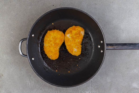 Die Schnitzel in einer großen Pfanne mit 2EL Olivenöl bei mittlerer Hitze auf jeder Seite 3–4Min. braten oder bis sie rundherum goldbraun und knusprig sind.