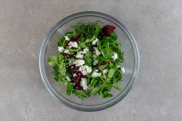 Den Feta grob zerkrümeln. Den Dill samt Stängeln grob schneiden. Die Rote Bete ggf. vorsichtig abgießen, dann halbieren und in ca. 0,5cm dicke Scheiben schneiden. 2EL Essig und 1EL Olivenöl verrühren und mit dem Dill und der Roten Bete vermengen. ⅔ des Feldsalats und die ½ des Feta unterheben und den Salat nach Geschmack mit Salz und Pfeffer würzen.