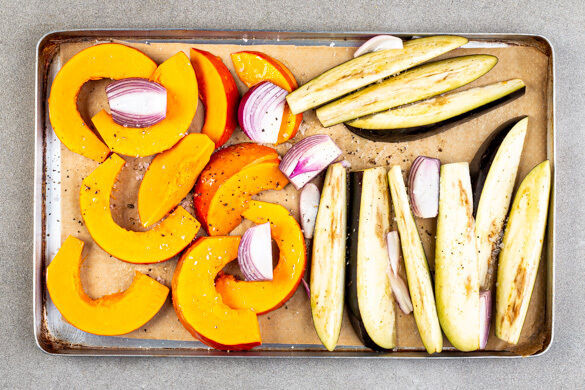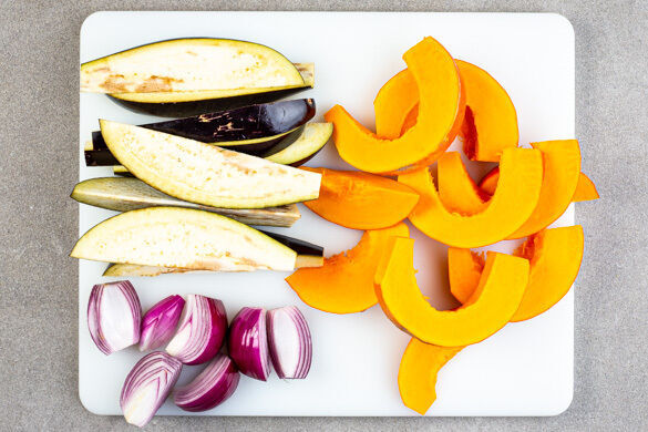 Den Kürbis halbieren, entkernen und in ca. 1cm dicke Spalten schneiden. Die Aubergine längs halbieren, dann der Länge nach in 1–2cm breite Spalten schneiden. Die Zwiebel schälen, halbieren und jede Hälfte in 3 Spalten schneiden.