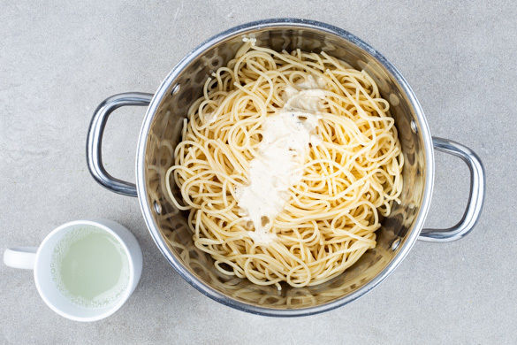 Die Pasta in das kochende Wasser geben und in 7–9Min. bissfest kochen. Ca. 1 Tasse Pastawasser abschöpfen, dann die Pasta in ein Sieb abgießen und abtropfen lassen. Inzwischen die Kürbiskerne in der kleinen Pfanne ohne Zugabe von Fett bei mittlerer Hitze 2–4Min. anrösten. Aus der Pfanne nehmen, fein hacken und mit den restlichen Hefeflocken sowie 1 Prise Salz vermengen.