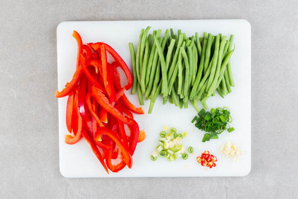 Die Paprika vierteln, entkernen und in dünne Streifen schneiden. Die Enden der Bohnen entfernen. Die Lauchzwiebel in feine Ringe schneiden, den grünen Teil beiseitelegen. Die Peperoni in feine Ringe schneiden. Tipp: Für weniger Schärfe die Kerne entfernen. Den Knoblauch schälen und fein würfeln.