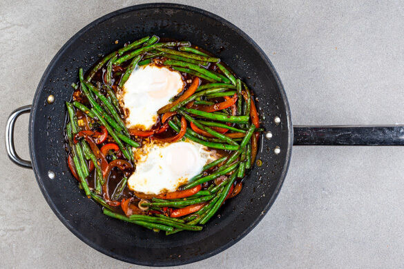 Heute zaubern wir dir die Aromenvielfalt der chinesischen Küche auf den Teller: Es gibt nämlich ein leckeres Stir Fry aus frischem Gemüse und einer herrlich geschmacksintensiven Sauce mit Hoisinsauce, in dem du kurzerhand auch noch das Ei pochierst. Das Ganze serviert sich ganz hervorragend auf fluffig-leichtem Sushireis. Simsalabim – sensationell!