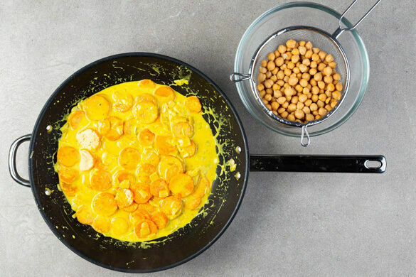 Ca. ⅔ des Currypulvers in die Pfanne geben und ca. 1Min. mitbraten. Das Gemüse mit der Kokosmilch und 200ml Wasser ablöschen, die Flüssigkeit zum Kochen bringen und ca. 10Min. sanft köcheln lassen, bis das Curry etwas eingedickt ist. Die Kichererbsen in einem Sieb mit kaltem Wasser abspülen und abtropfen lassen.
