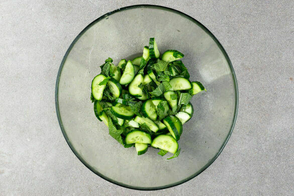 Die Gurke längs halbieren und in dünne Scheiben schneiden. Die Minzeblätter von den Stängeln zupfen und grob schneiden. 3EL hellen Essig, 1EL Zucker und 1 kräftige Prise Salz verrühren, bis Zucker und Salz sich aufgelöst haben, dann mit den Gurken und der Minze vermengen und beiseitestellen.