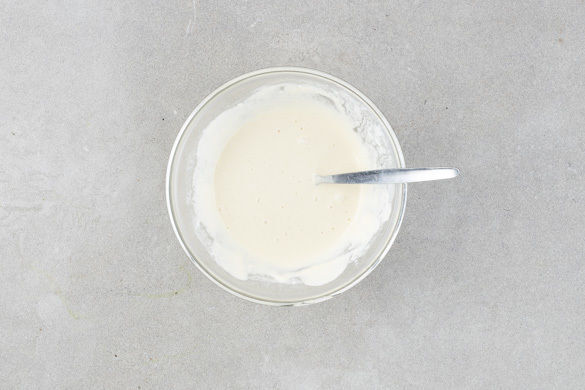 200ml kaltes Wasser mit 3EL Senf verrühren, dann 160g Mehl und 2TL Backpulver unterrühren und den Teig mit 1 kräftigen Prise Salz würzen.