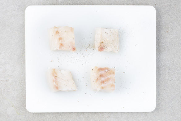 Den Backofen auf 240°C (220°C Umluft) vorheizen. Den Fisch mit kalten Wasser abspülen und trocken tupfen, dann in 10–12 gleich große Stücke schneiden. Evtl. vorhandene Gräten mit einer Pinzette entfernen und den Fisch mit Salz und Pfeffer würzen.