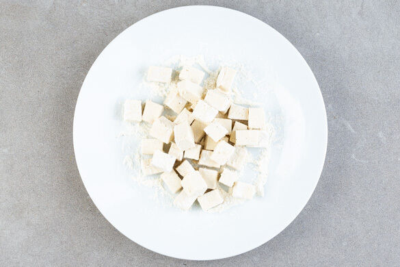 2EL Mehl mit je 1 kräftigen Prise Salz und Pfeffer vermengen. Den Tofu trocken tupfen, in ca. 2cm große Würfel schneiden und in dem Mehl wenden.